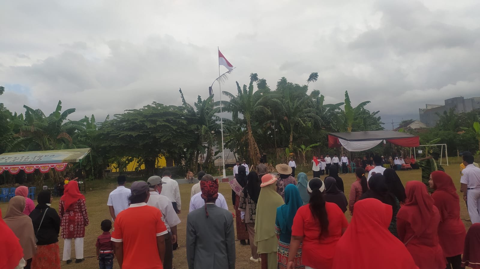 Bapak-bapak, Ibu-ibu, remaja putra dan putri hingga anak-anak ambil bagian dalam upacara bendera yang dilaksanakan secara sederhana di lapangan sepak bola setempat.