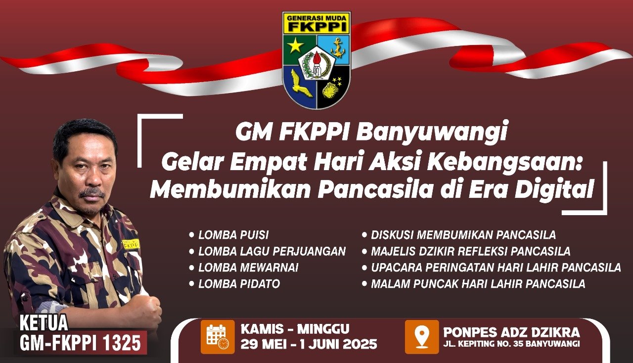 Banyuwangi, seblang.com – Menyambut Hari Lahir Pancasila yang jatuh pada 1 Juni 2025, GM FKPPI PC-1325 Banyuwangi menggelar rangkaian Aksi Kebangsaan selama empat hari, mulai 29 Mei hingga 1 Juni. Kegiatan ini mengusung tema “Pancasila dalam Tindakan: Semangat Gotong Royong GM FKPPI Membangun Negeri.”