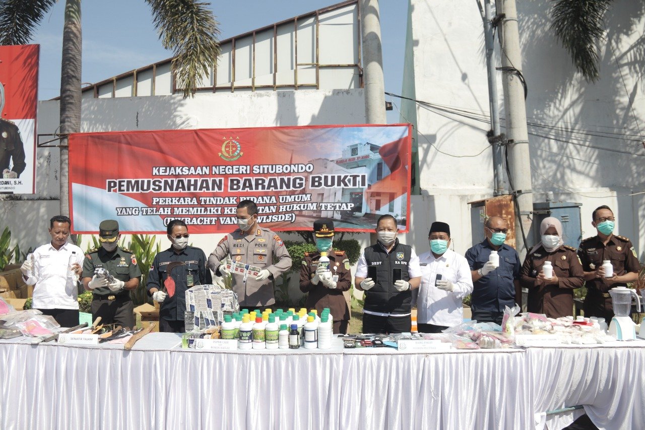 Acara pemusnahan ini dihadiri oleh sejumlah pejabat tinggi, termasuk Ketua dari Pengadilan Negeri Situbondo, Kapolres Situbondo, Komandan Kodim Situbondo, Karutan Situbondo Dinas Kesehatan, dan instansi terkait lainnya. Barang bukti yang dimusnahkan berasal dari 220 perkara, meliputi 202 perkara pidana biasa dan 18 perkara tindak pidana ringan yang diselesaikan sejak Mei 2024 hingga Juli 2025.