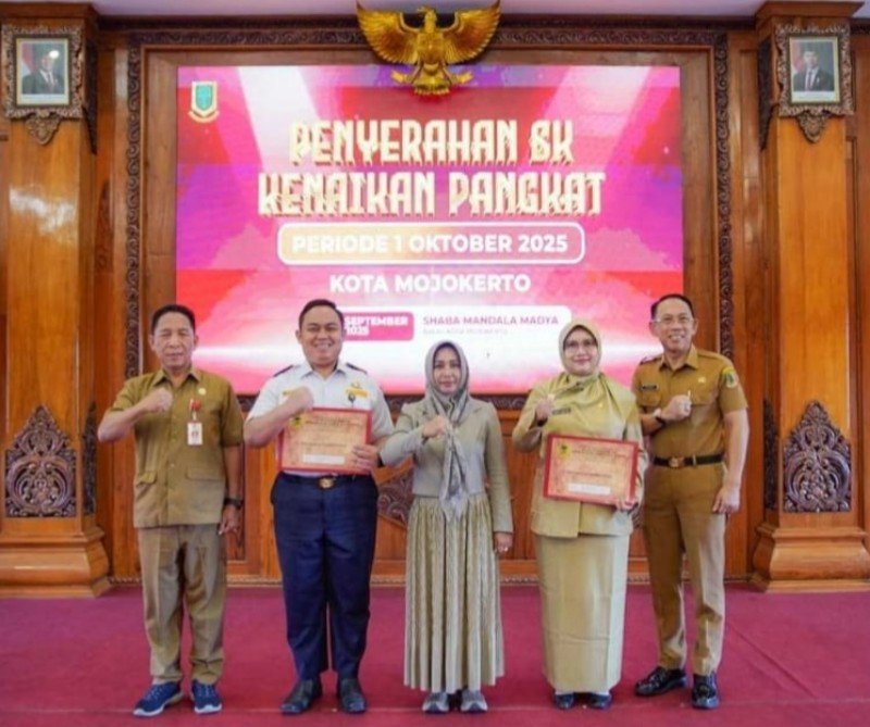 Kota Mojokerto, seblang.com – Sebanyak 56 Aparatur Sipil Negara (ASN) di lingkungan Pemerintah Kota Mojokerto resmi menerima Surat Keputusan (SK) Kenaikan Pangkat periode 1 Oktober 2025. Penyerahan dilakukan langsung oleh Wali Kota Mojokerto, Ika Puspitasari, di Ruang Sabha Mandala Madya, Balai Kota Mojokerto, Senin (15/9/2025).