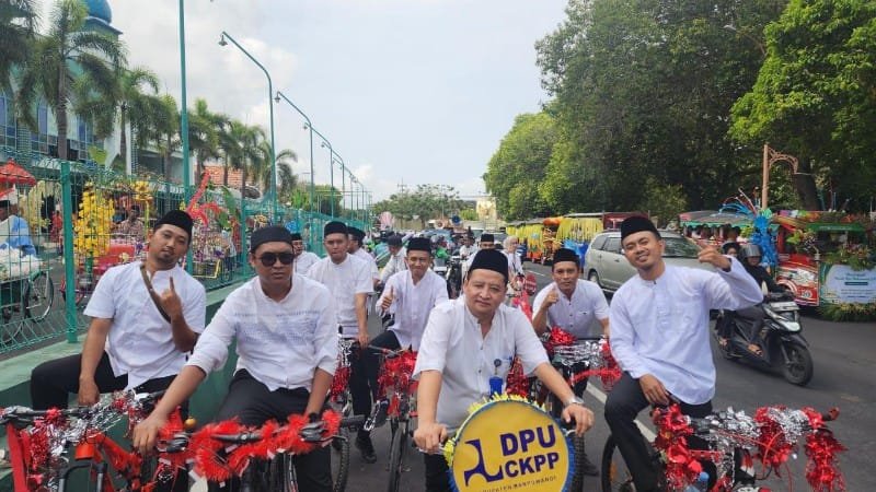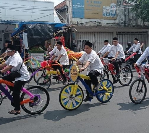 Mengenakan busana islami, jajaran staf Dinas PU CKPP ambil bagian dalam kirab jodang endog-endogan. Mereka tampak antusias mengayuh sepeda hias bersama Bupati Banyuwangi, Ipuk Fiestiandani, menyusuri rute kirab mengarak jodang.