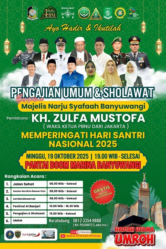 “Berdasarkan kupon yang beredar, peserta Jalan Sehat Santri mencapai 18 ribu orang. Untuk Festival Banjari tercatat diikuti 25 grup dari berbagai kecamatan di Banyuwangi, sedangkan Senam Gembira Banser akan diikuti sekitar 2.500 peserta dari Yayasan Pendidikan Muslimat Nahdlatul Ulama (YPMNU) Banyuwangi,” jelas KH. Marfu’ Ali, Rabu (15/10/2025).
