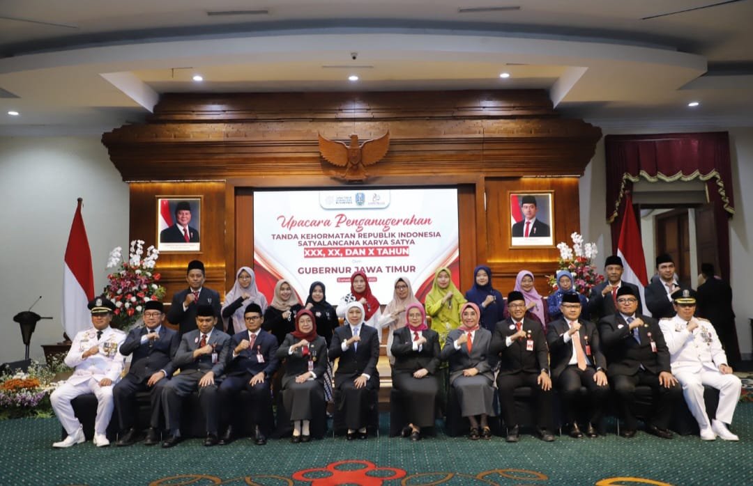 Surabaya, seblang.com – Gubernur Jawa Timur Khofifah Indar Parawansa menuntaskan prosesi penyematan Tanda Kehormatan Satyalancana Karya Satya (SLKS) kepada 653 Aparatur Sipil Negara (ASN) Pemerintah Provinsi Jawa Timur di Gedung Negara Grahadi, Surabaya, Selasa (14/10/2025).