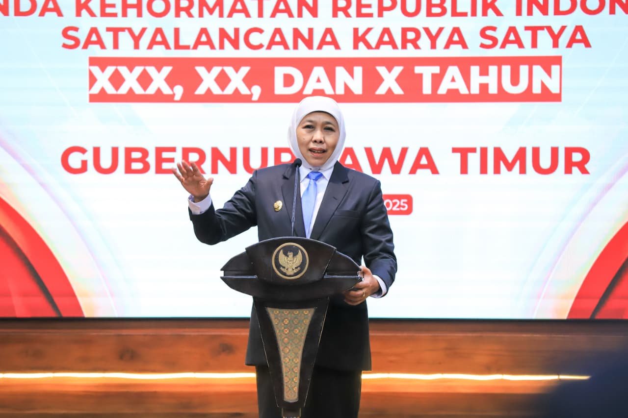 Surabaya, seblang.com – Gubernur Jawa Timur Khofifah Indar Parawansa menuntaskan prosesi penyematan Tanda Kehormatan Satyalancana Karya Satya (SLKS) kepada 653 Aparatur Sipil Negara (ASN) Pemerintah Provinsi Jawa Timur di Gedung Negara Grahadi, Surabaya, Selasa (14/10/2025).