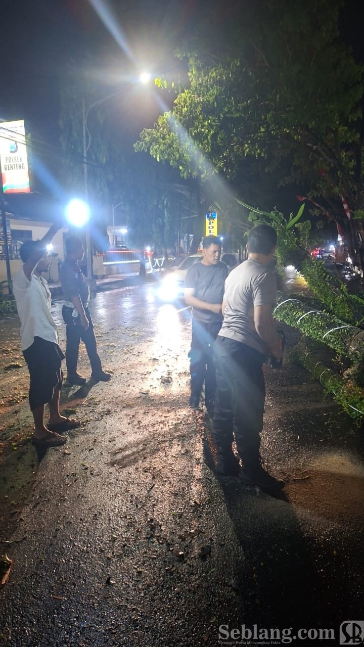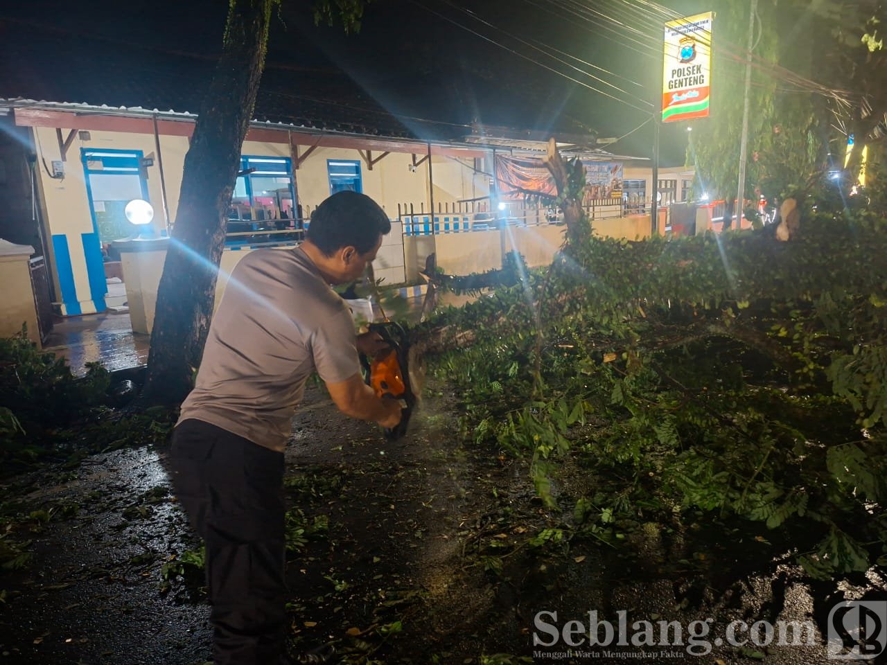 Banyuwangi, seblang.com — Hujan deras disertai angin kencang yang melanda wilayah Kecamatan Genteng pada Kamis malam (30/10/2025) menyebabkan beberapa pohon tumbang di sepanjang Jalan KH. Wahid Hasyim, Desa Genteng Kulon, Kecamatan Genteng, Kabupaten Banyuwangi. Salah satu di antaranya tumbang tepat di depan Mapolsek Genteng.