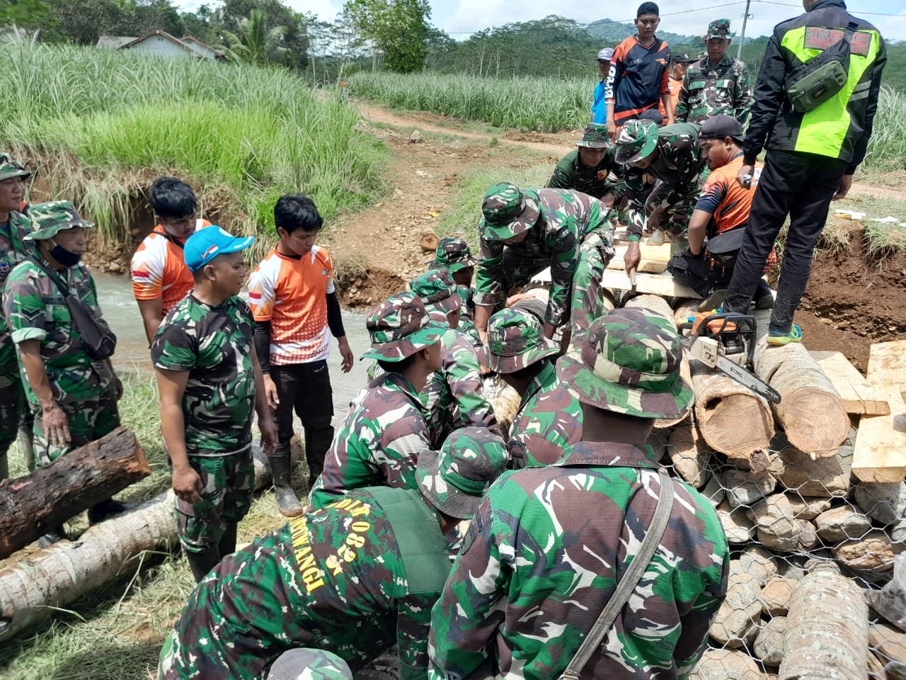 “Kita bangun jembatan darurat agar warga masyarakat kembali memiliki akses jalan penghubung,” kata anggota Koramil Pesanggaran, Dwi Hariyanto.