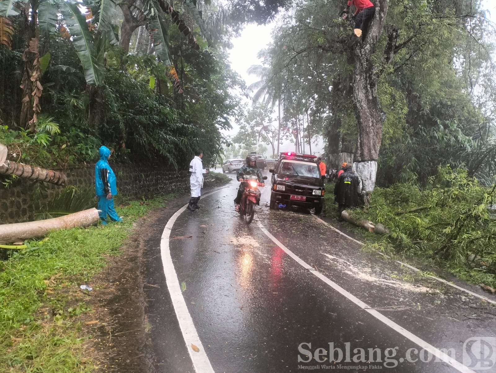 Banyuwangi, seblang.com – Hujan deras yang mengguyur wilayah Kecamatan Glagah pada Kamis (12/2/2026) siang mengakibatkan sebuah pohon jenis sengon berdiameter sekitar 50 cm tumbang di area Tikungan Cawan, Dusun Salakan, Desa Kenjo. Pohon tersebut roboh melintang di badan jalan dan sempat memutus arus lalu lintas yang menghubungkan Kecamatan Glagah dengan Kecamatan Licin.