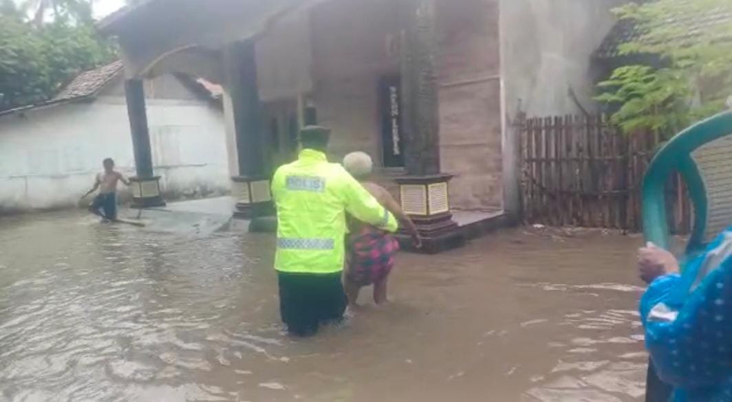 Tim SAR Polsek Banyuwangi yang dikomandoi langsung oleh Kapolsek AKP Kusmin terjun langsung ke titik-titik lokasi banjir akibat yang disebabkan meluapnya air di empat sungai akibat hujan lebat yang terjadi mulai Minggu (16/10/2022) malam.
