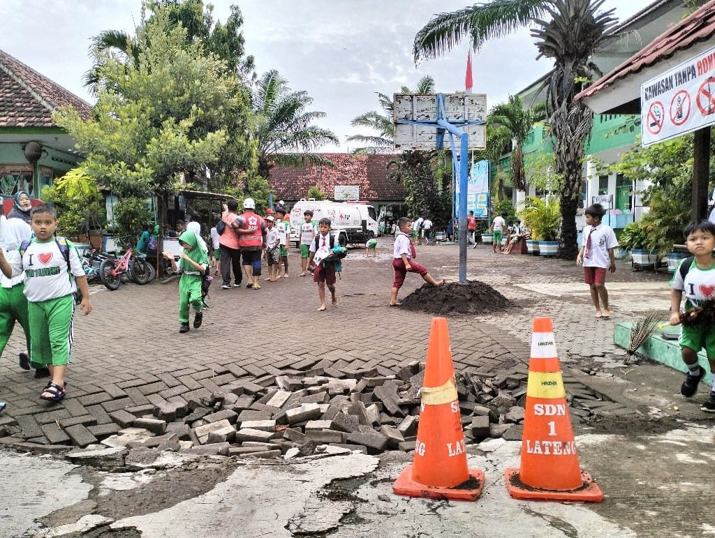 Mobil PMI juga turut diterjunkan membantu membersihkan sisa kotoran lumpur di halaman sekolah dan kelas./////