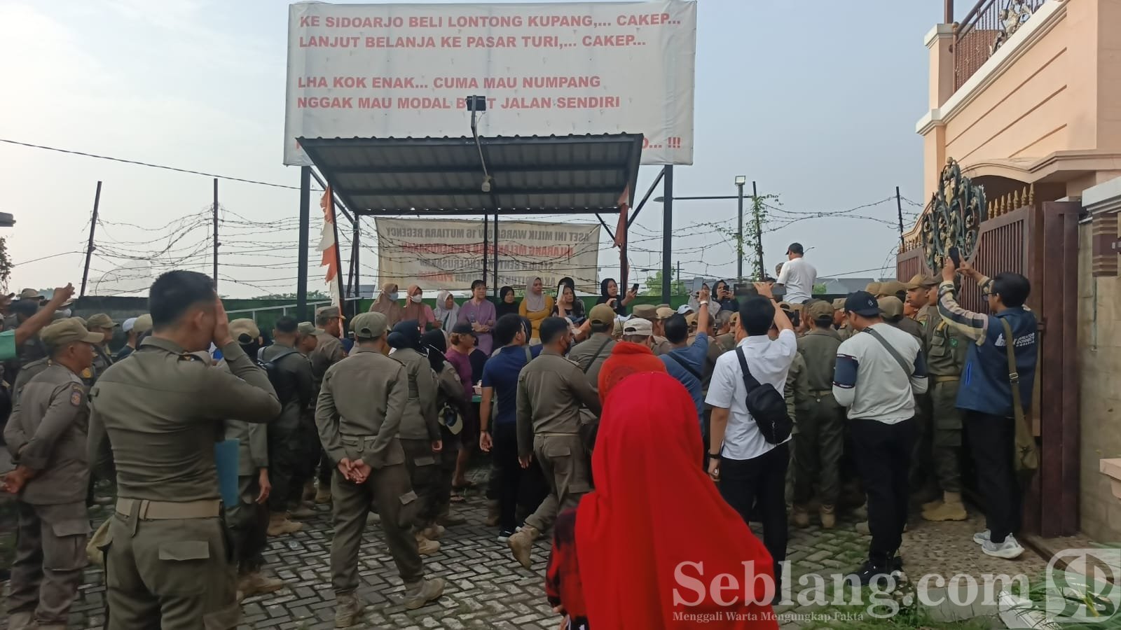 Sidoarjo, seblang.com – Puluhan emak-emak bersama warga Perumahan Mutiara Regency menggelar aksi penolakan terhadap rencana Pemerintah Kabupaten (Pemkab) Sidoarjo membuka akses jalan antara Perumahan Mutiara Regency dan Mutiara City. Aksi tersebut membuat rencana pembongkaran tembok pembatas di wilayah Desa Banjarbendo dan Desa Jati batal dilaksanakan, Selasa (30/12/2025).