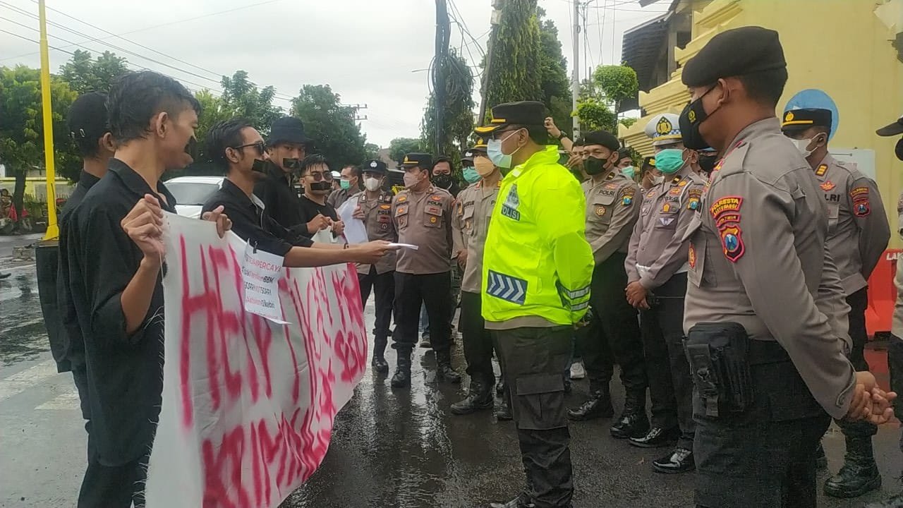 Menanggapi hal tersebut sejumlah mahasiswa yang menamakan diri Aliansi Mahasiswa Banyuwangi mendatangi Polresta Banyuwangi dengan menggelar aksi bisu sembari membentangkan spanduk bertuliskan “Hentikan Kriminalisasi Mahasiswa”, Selasa (20/9/2022).