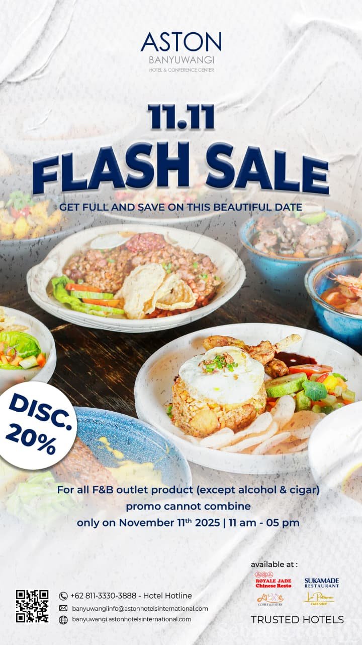 Banyuwangi, seblang.com – Dalam rangka menyambut momen istimewa 11.11, ASTON Banyuwangi Hotel & Conference Center menghadirkan promo eksklusif bertajuk “11.11 Flash Sale”. Hanya pada 11 November 2025, mulai pukul 11.00 hingga 17.00 WIB, para tamu dapat menikmati diskon 20% untuk semua produk Food & Beverage (F&B) di seluruh outlet hotel berbintang empat tersebut.