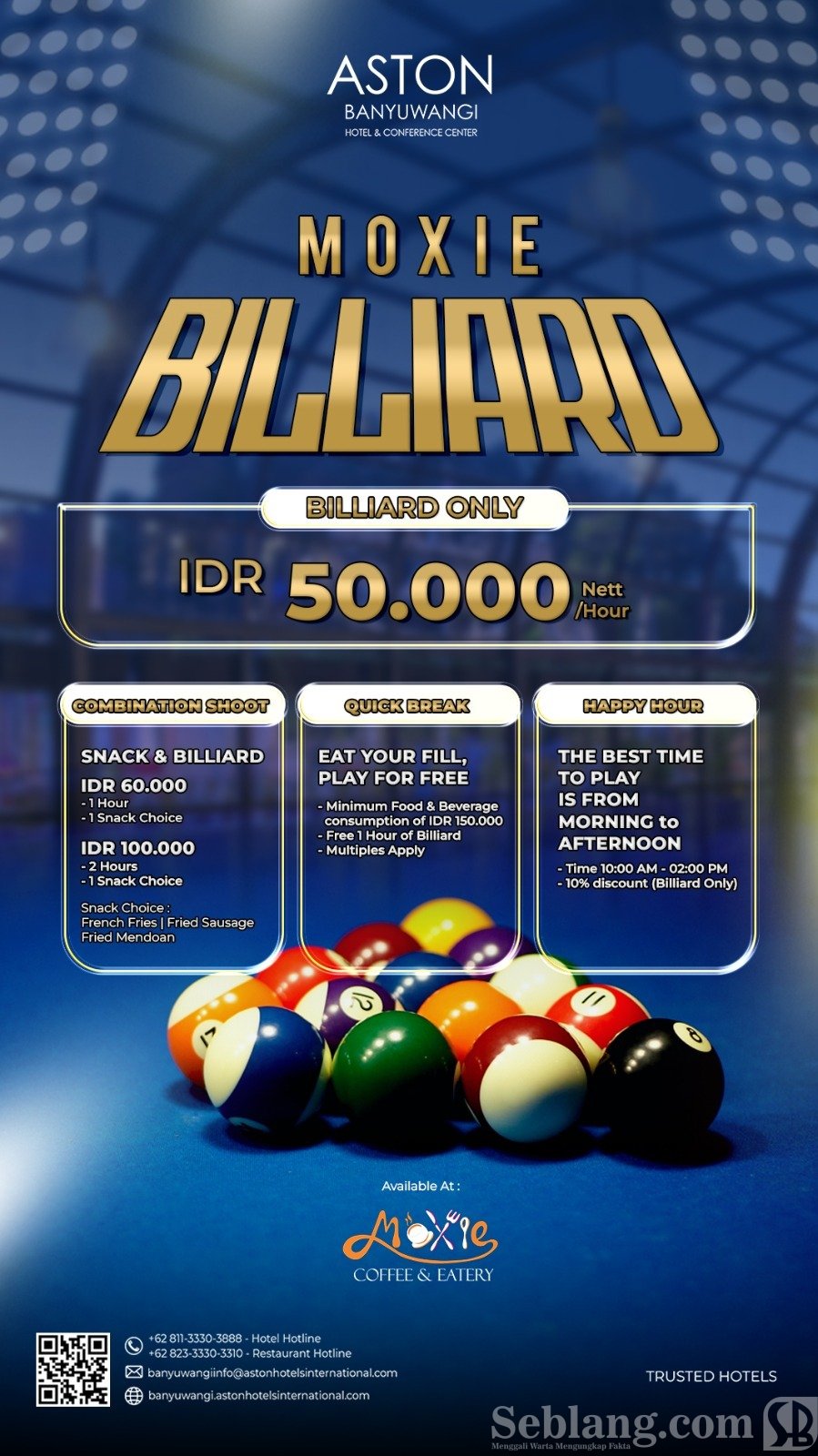 Saat ini, Moxie Billiard telah resmi dibuka dan dapat dinikmati setiap hari di Moxie Coffee & Eatery, Aston Banyuwangi Hotel & Conference Center. Fasilitas ini terbuka bagi tamu hotel maupun masyarakat umum yang ingin menikmati suasana santai sambil berkuliner dan berhibur.////////