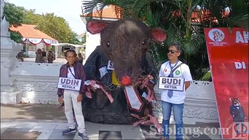 Banyuwangi, seblang.com – Peringatan Hari Antikorupsi Sedunia (Hakordia) 2025 di Banyuwangi diwarnai aksi unik dan penuh pesan simbolik. Forum Anak Bangsa Menggugat menggelar unjuk rasa di depan Kantor Bupati Banyuwangi, Selasa (9/12/2025), dengan membawa replika tikus raksasa sebagai lambang perlawanan terhadap praktik korupsi.