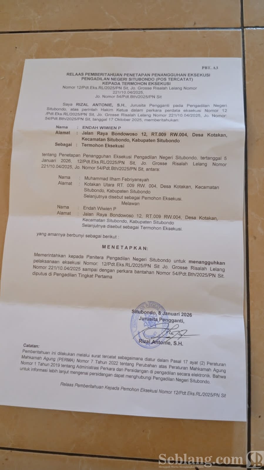 “Kami melakukan tindakan tersebut karena hingga saat ini belum ada eksekusi secara sah dari PN Situbondo. Surat resmi dari pengadilan tertanggal 8 Januari pun menyatakan bahwa eksekusi masih ditangguhkan. Jadi, jangan ada pihak yang seolah-olah bertindak sebagai eksekutor dengan memasang plang sebelum ada ketetapan hukum final,” tambahnya.