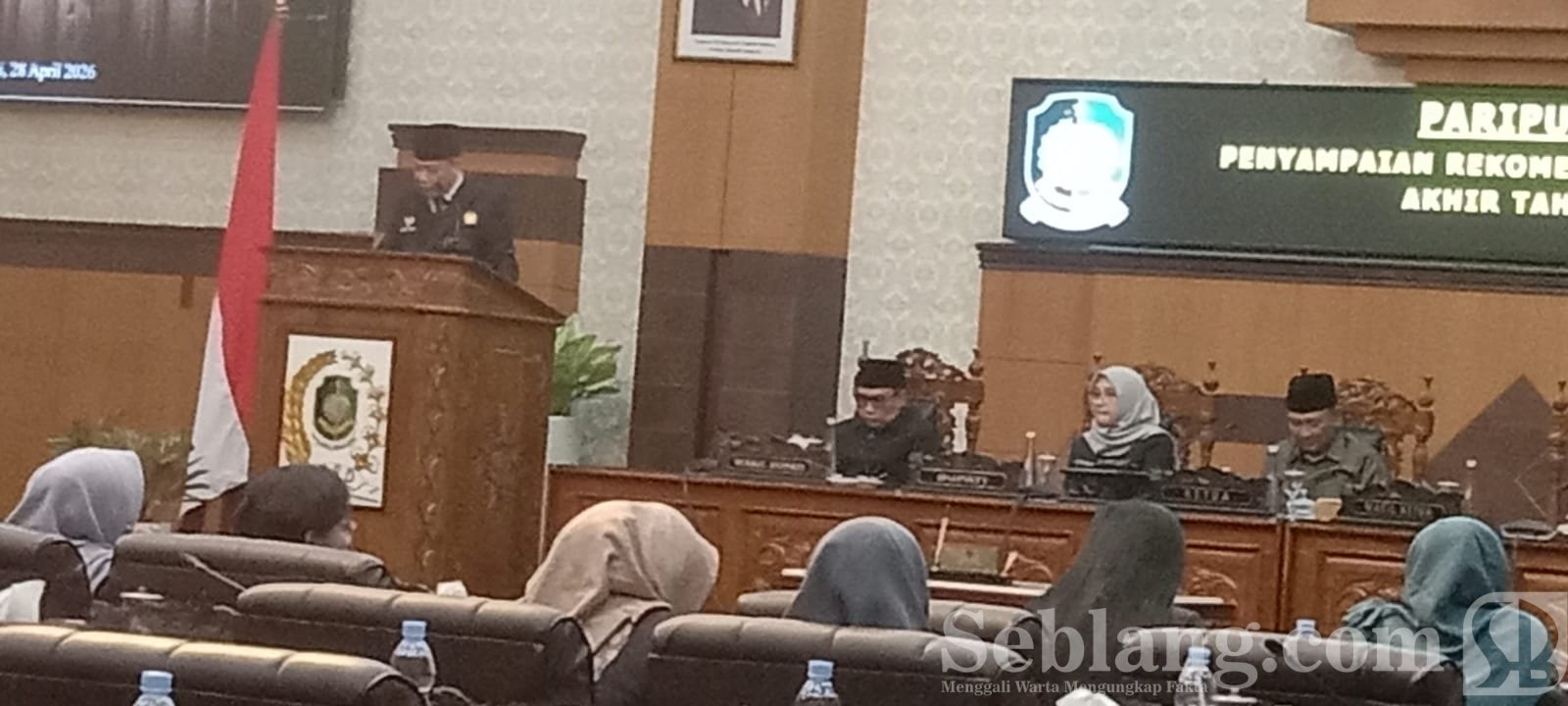 Banyuwangi, seblang.com – Dewan Perwakilan Rakyat Daerah (DPRD) Kabupaten Banyuwangi menggelar rapat paripurna istimewa dengan agenda penyampaian rekomendasi dewan atas Laporan Keterangan Pertanggungjawaban (LKPJ) Bupati akhir Tahun Anggaran 2025 di Ruang Rapat Paripurna dewan, Selasa (28/4/2026) malam.