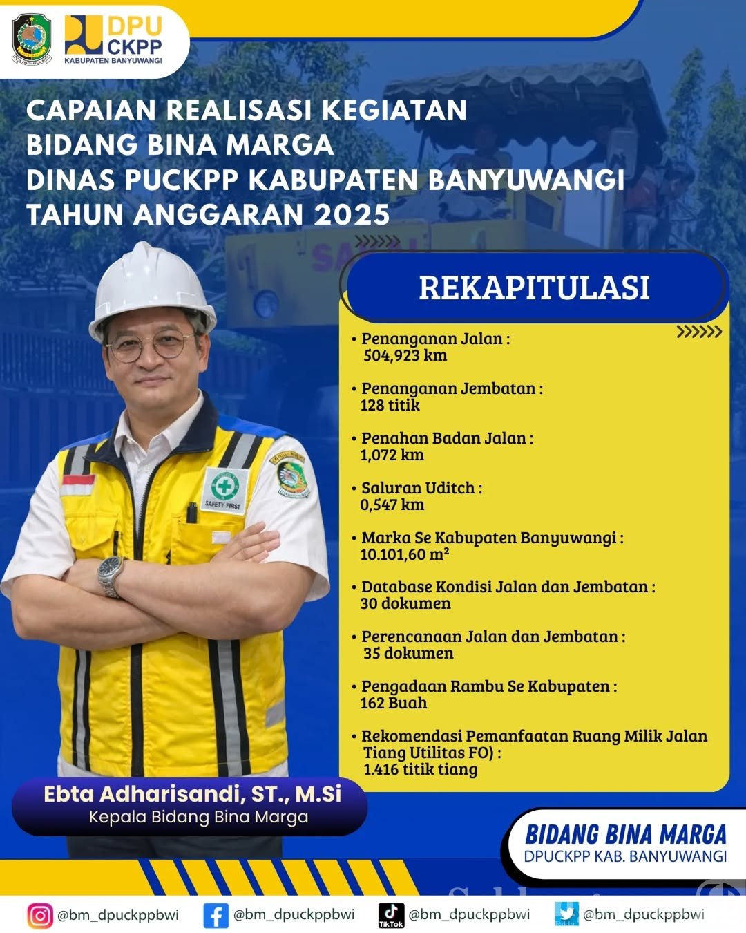 Kepala Bidang Bina Marga DPU CKPP Banyuwangi, Ebta Adharisandi, mengatakan capaian tersebut merupakan hasil pelaksanaan berbagai program pembangunan, pemeliharaan, rehabilitasi, dan rekonstruksi infrastruktur.
