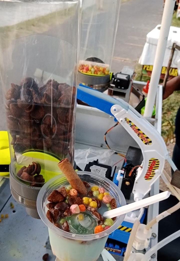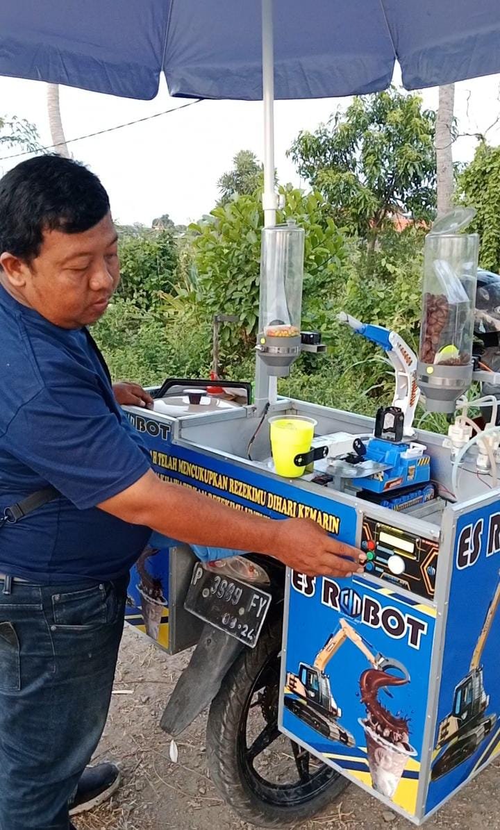 “Ini mungkin yang terbaru. Saya mencoba cara baru berjualan menggunakan layanan digital, yaitu Es Robot. Pembeli cukup menekan tombol varian rasa yang diinginkan, lalu robot di atas gerobak saya akan melayani sendiri,” ujarnya.