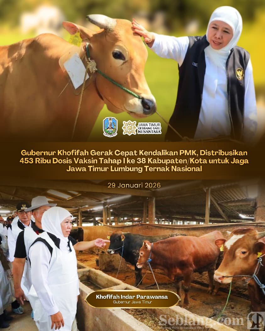 Surabaya, seblang.com – Gubernur Jawa Timur Khofifah Indar Parawansa memastikan Pemerintah Provinsi Jawa Timur bergerak cepat merespons peningkatan kasus Penyakit Mulut dan Kuku (PMK) di awal tahun 2026 melalui percepatan vaksinasi massal sebagai langkah pengendalian sekaligus perlindungan populasi ternak.