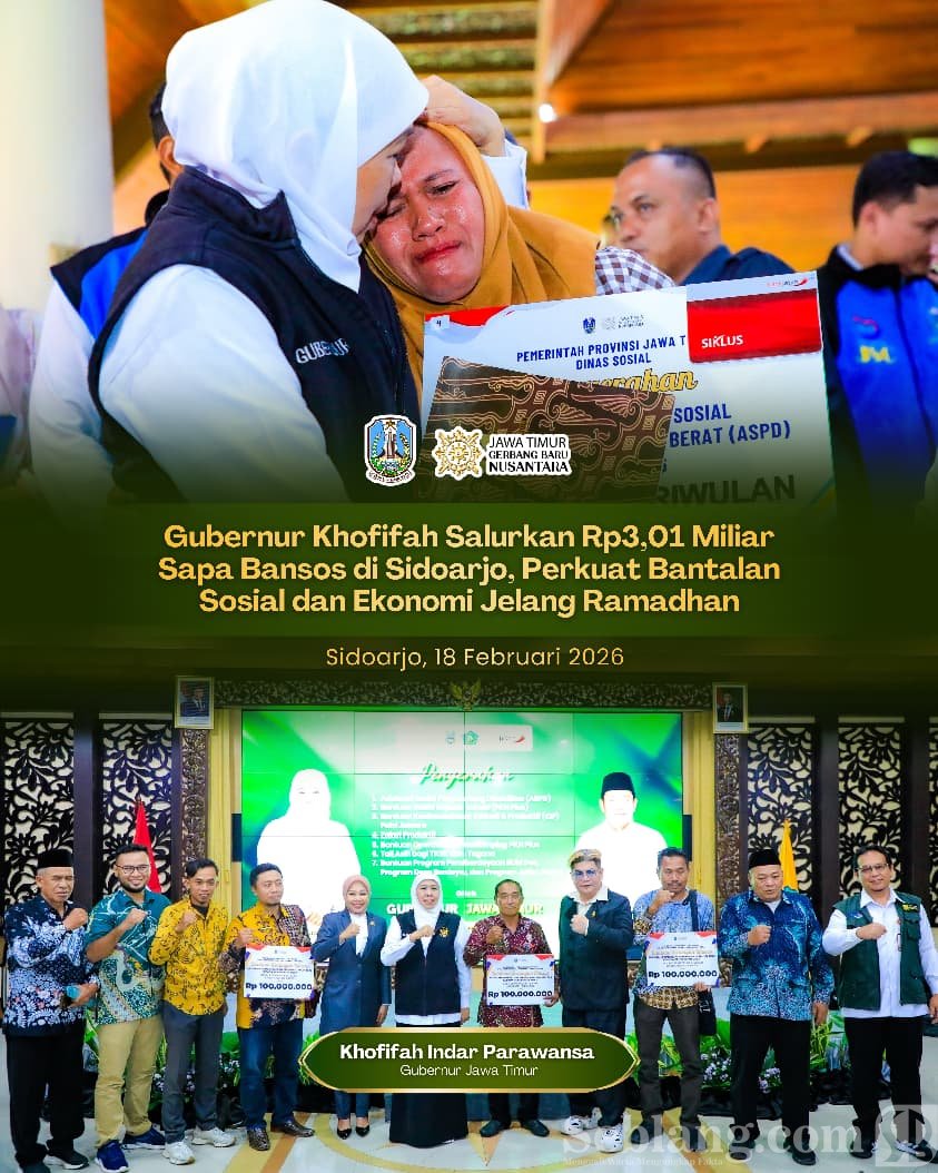 Sidoarjo, seblang.com – Gubernur Khofifah Indar Parawansa menyalurkan bantuan sosial dan program pemberdayaan masyarakat desa di Sidoarjo senilai total Rp3.016.350.000 melalui kegiatan Sapa Bansos yang digelar di Pendopo Kabupaten Sidoarjo, Rabu (18/2), bertepatan awal Bulan Suci Ramadan 1447 Hijriah.