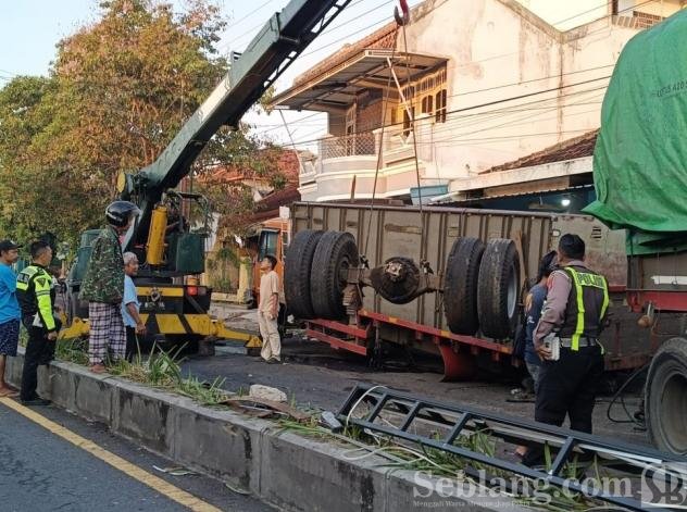 Banyuwangi, seblang.com – Sebuah truk gandeng mengalami kecelakaan tunggal di Jalan Gajah Mada, selatan Simpang 4 Penataban, Kecamatan Giri, Jumat dini hari (10/4/2026). Insiden tersebut terjadi saat sopir berupaya menghindari seorang anak yang tiba-tiba menyeberang jalan.