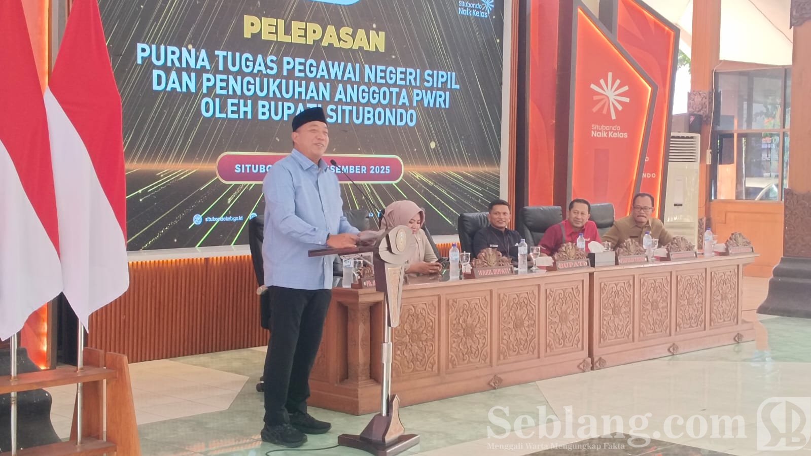 Situbondo, seblang.com – Pemerintah Kabupaten Situbondo menggelar upacara pelepasan purna tugas pegawai negeri sipil (PNS), sekaligus pengukuhan anggota Persatuan Wredatama Republik Indonesia (PWRI), Selasa (23/12/2025). Acara yang berlangsung khidmat di Pendopo Rakyat Situbondo ini menjadi bentuk penghormatan atas pengabdian panjang 140 aparatur sipil negara (ASN).