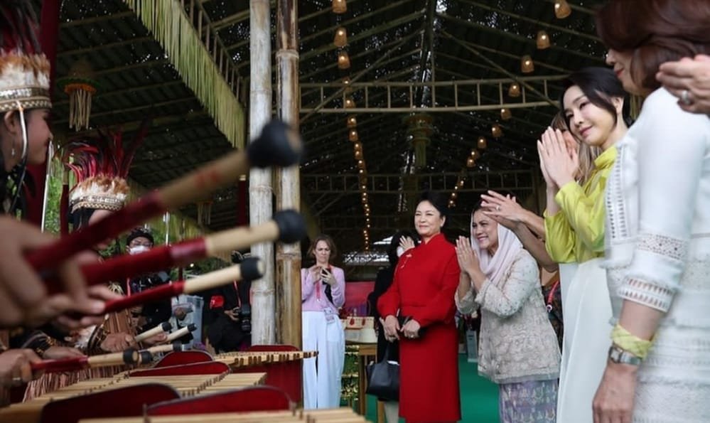 sekitar pukul 09.00 Wita, satu persatu pendamping pemimpin negara berdatangan di Lobby. mulai dari pendamping presiden Spanyol Maria Begona Gomez Fernandez, pendamping presiden Turki Emine Erdogan, pendamping perdana menteri Jepang Yuko Kishida, pendamping presiden Komisi Eropa Heiko von der Leyen, pendamping presiden Republik Korea Kim Keon-hee, dan pendamping presiden China Peng Liyuan.