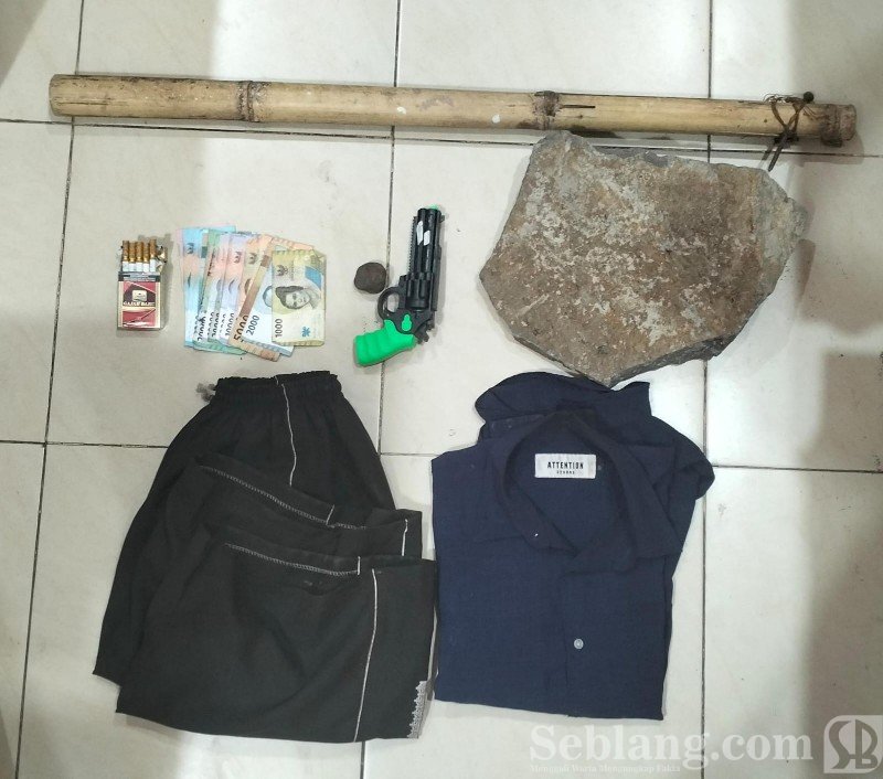 Dari tangan pelaku, polisi menyita sejumlah barang bukti, di antaranya pistol mainan, pakaian pelaku, batu kecil dan besar, bambu, rokok, serta uang tunai Rp513 ribu yang diduga sisa hasil pemerasan.
