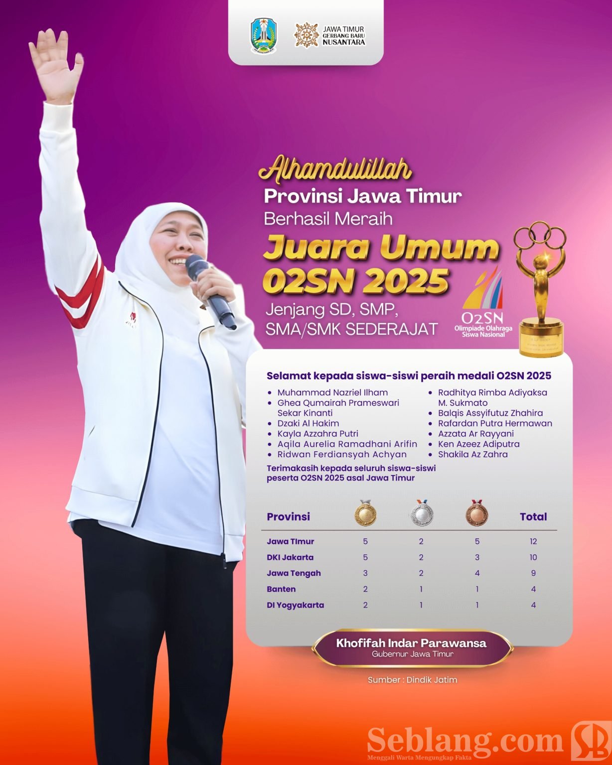 Surabaya, seblang.com — Provinsi Jawa Timur kembali menorehkan prestasi membanggakan dengan menjadi Juara Umum Olimpiade Olahraga Siswa Nasional (O2SN) Tahun 2025.