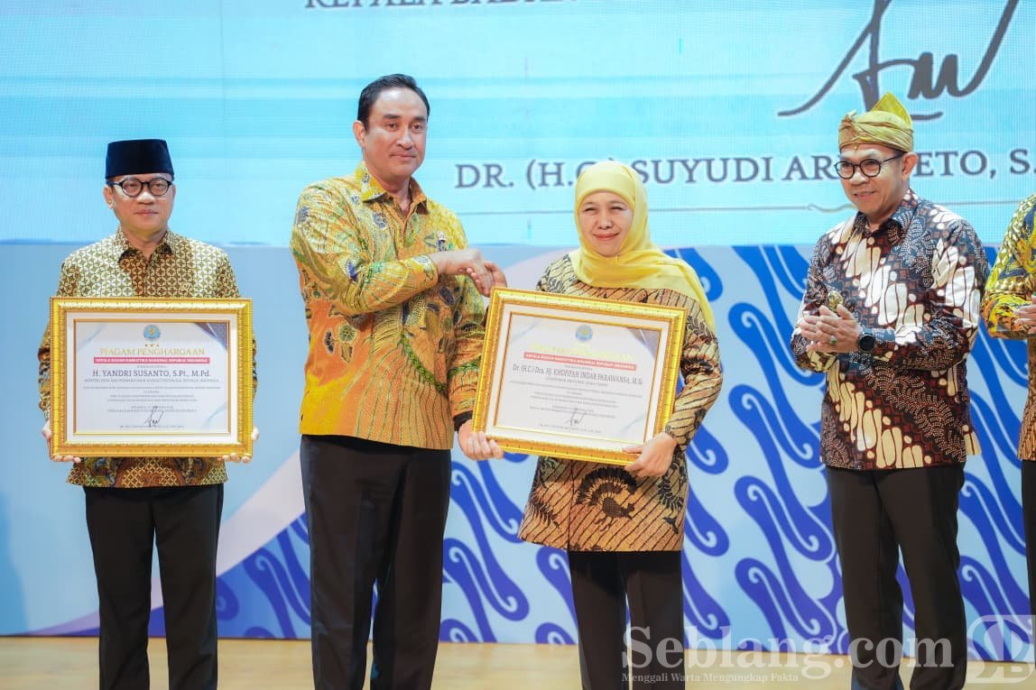 Pada kesempatan itu, Gubernur Jawa Timur Khofifah Indar Parawansa juga menerima penghargaan yang diserahkan langsung oleh Kepala BNN RI Suyudi Ario Seto atas komitmen dan jasanya dalam mewujudkan Indonesia Bersih Narkoba.