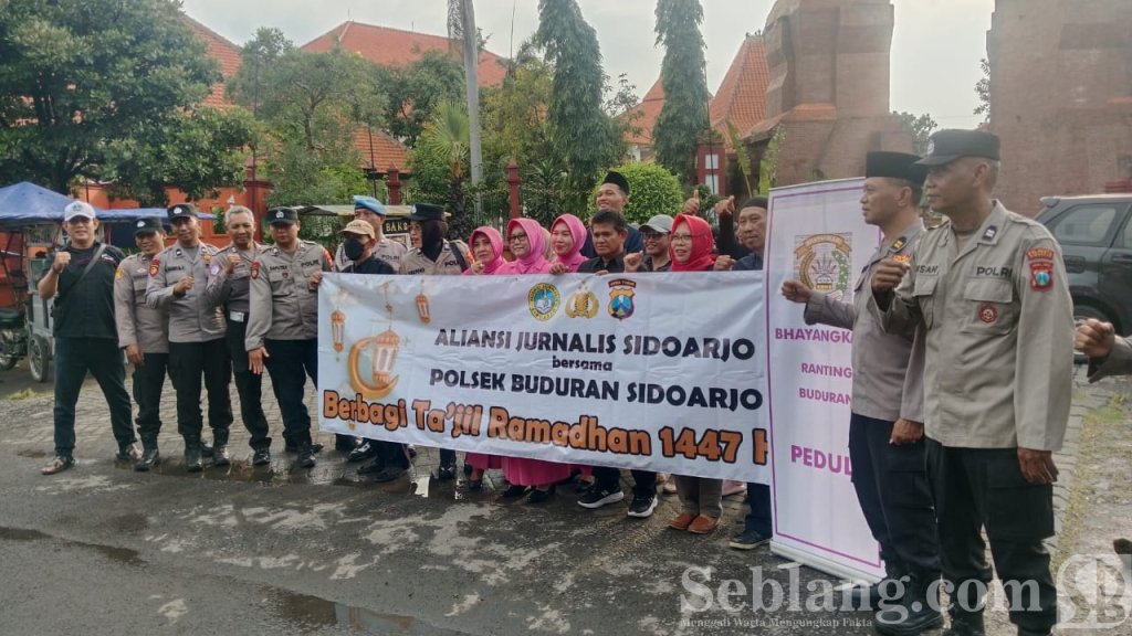 Sidoarjo, seblang.com – Aliansi Jurnalis Sidoarjo (AJS) bersama jajaran Polsek Buduran membagikan ratusan paket takjil kepada para pengguna jalan di depan Museum Mpu Tantular, Kabupaten Sidoarjo, Jumat (6/3/2026) sore. Kegiatan ini dilakukan sebagai bentuk kepedulian sosial sekaligus memanfaatkan momentum berkah bulan Ramadan 1447 Hijriah.