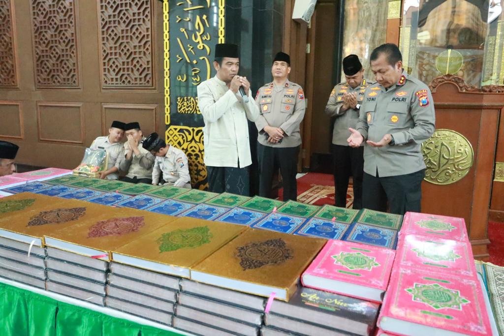 Pembagian kitab suci oleh Kapolda Jatim Irjen Pol Toni Harmanto ini dilakukan secara simbolis dengan menyerahkan kitab suci Al-Qur’an kepada takmir masjid Arif Nurul Huda sebanyak 8000 Al-Qur’an.