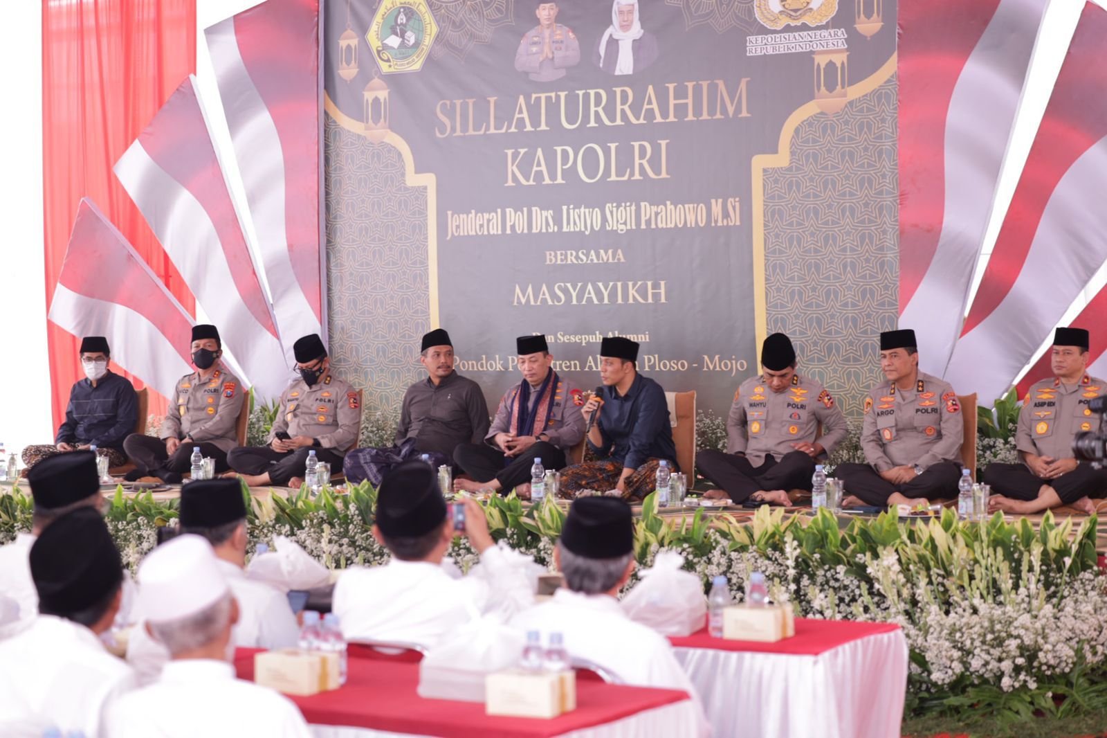Kediri, seblang.com – Kapolri Jenderal Listyo Sigit Prabowo beserta rombongan diantaranya Asrena Kapolri Irjen Pol Wahyu Hadiningrat, As SDM Kapolri Irjen Pol Wahyu Widada, Aslog Kapolri Irjen Pol R.P Argo Yuwono dan Dirtipidsiber Bareskrim Polri Brigjen Asep Edi Suheri dengan didampingi Kapolda Jatim Irjen Pol Nico Afinta serta pejabat utama Polda Jatim bersilaturahmi bersama Masyayikh dan sesepuh serta pengasuh Pondok Pesantren (Ponpes) Al Falah Ploso Kabupaten Kediri. Sabtu (6/8/2022).