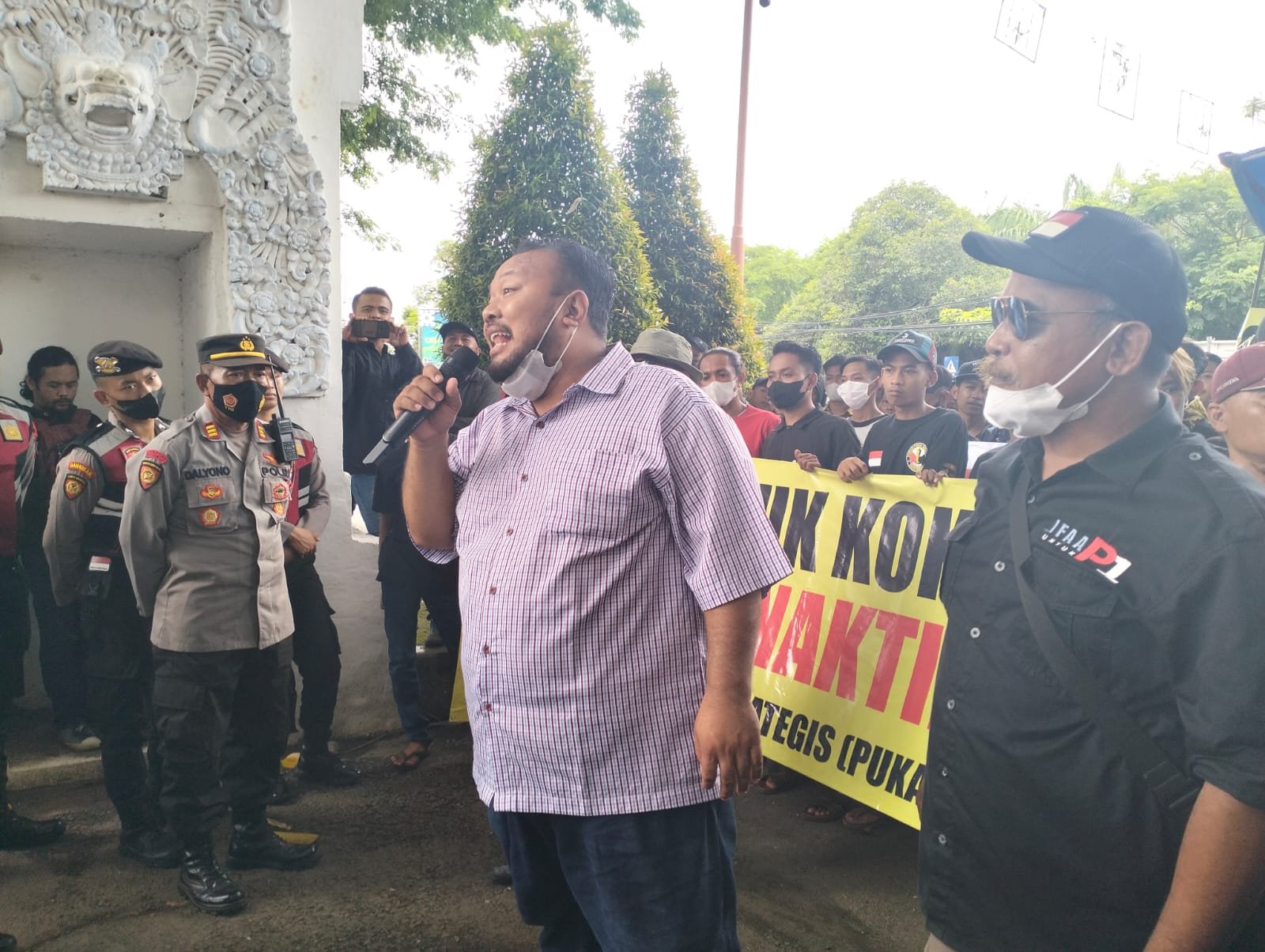 Dalam orasinya, Amrullah mendesak kepada Bupati Banyuwangi, Ipuk Fiestandani segera menonaktifkan NH karena telah ditetapkan tersangka oleh Kejari Banyuwangi atas dugaan korupsi anggaran mamin yang merugikan negara Rp 400 jutaan.