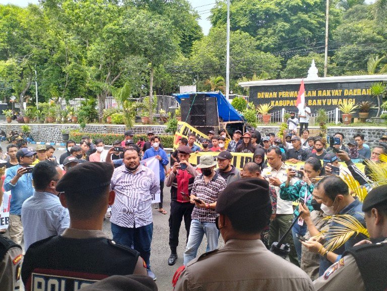 Banyuwangi, seblang.com – Puluhan massa Pusat Kajian Kebijakan dan Pembangunan Strategi (Puskaptis) berunjuk rasa di Kantor Bupati Banyuwangi, Rabu (9/11/2022).