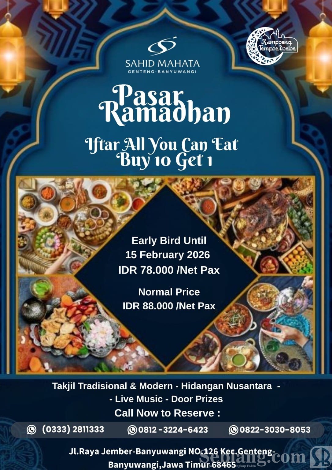 Pasar Ramadan digelar di Sahid Mahata Genteng, Jl. Raya Jember–Banyuwangi No.126, Kecamatan Genteng, Banyuwangi. Reservasi dapat dilakukan melalui (0333) 2811333, 0812-3224-6423, atau 0822-3030-8053./////////