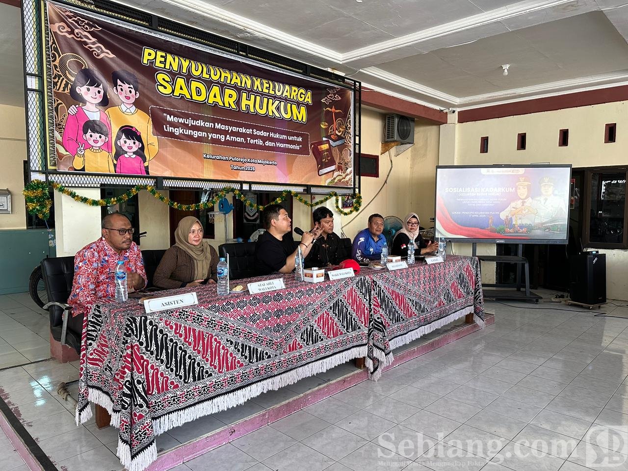 Kota Mojokerto, seblang.com. – Pemerintah Kota Mojokerto terus mendorong peningkatan kesadaran hukum masyarakat melalui sosialisasi Keluarga Sadar Hukum (Kadarkum) yang digelar di Kelurahan Pulorejo, Jumat (17/4/2026). Kegiatan ini mengusung tema “Mewujudkan Masyarakat Sadar Hukum untuk Lingkungan yang Aman, Tertib, dan Harmonis.”