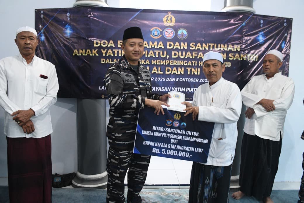 Banyuwangi, seblang.com – Suasana haru sekaligus khidmat mewarnai kegiatan sosial yang digelar Pangkalan TNI Angkatan Laut (Lanal) Banyuwangi. Dalam rangka memperingati Hari Ulang Tahun TNI Angkatan Laut ke-80 yang jatuh pada 10 September 2025, sekaligus menyongsong HUT TNI ke-80 pada 5 Oktober 2025 mendatang, Lanal Banyuwangi mengadakan doa bersama dan penyerahan santunan bagi anak yatim piatu, dhuafa, serta santri.