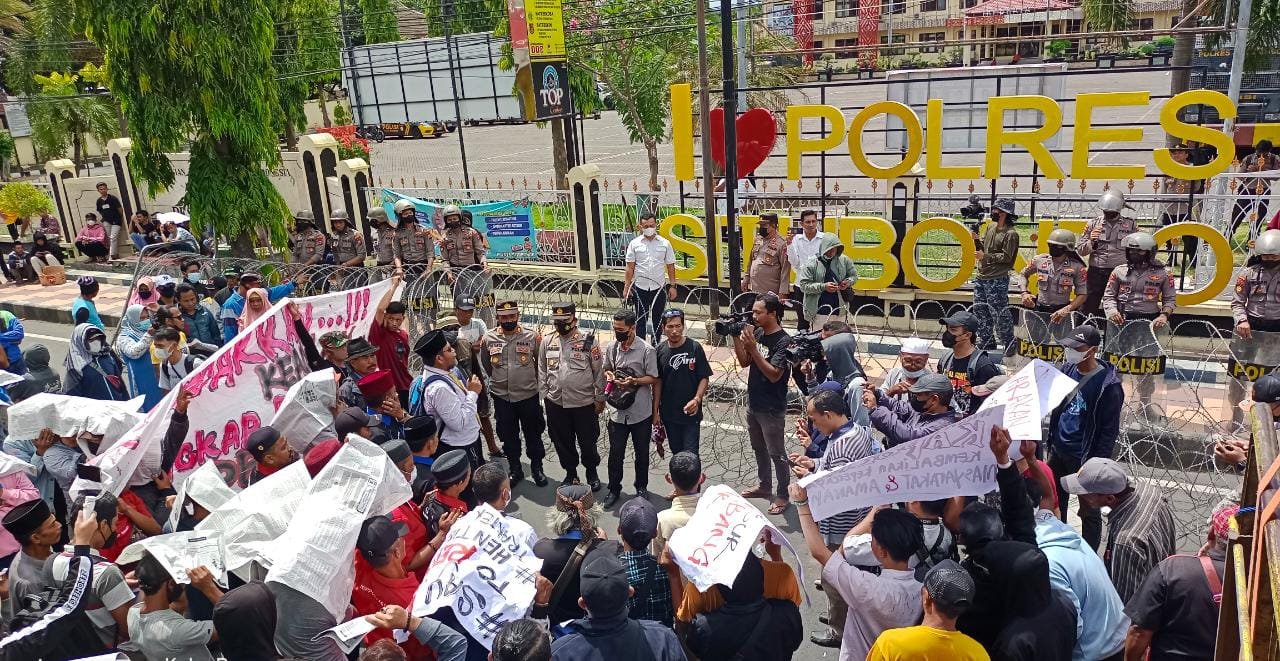 Situbondo, seblang.com – Ratusan warga yang tergabung dengan Lembaga Bantuan Hukum Gerakan Keadilan Sosial Bagi Seluruh Rakyat Indonesia LBH (GKSBASRA) dan Lembaga Gerakan Perlawanan Situbondo Anti Korupsi Edukasi Resistensi Advokasi (GP SAKERA) Situbondo melakukan unjuk rasa di depan Polres Situbondo.