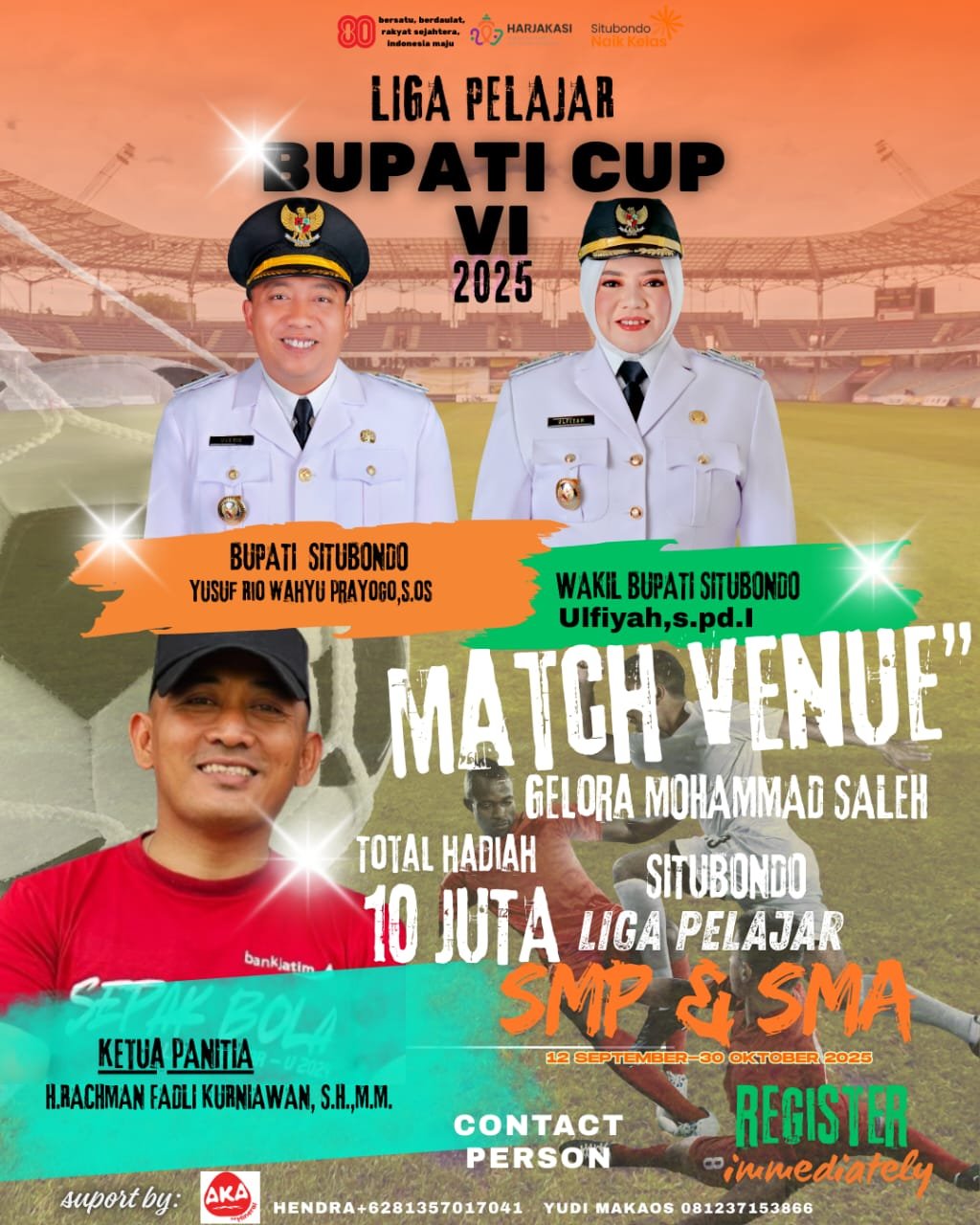 “Melalui Liga Pelajar Bupati Cup VI, kami ingin menanamkan nilai disiplin, sportivitas, dan semangat kebersamaan kepada para pelajar Situbondo,” ujarnya, Sabtu (6/9/2025).