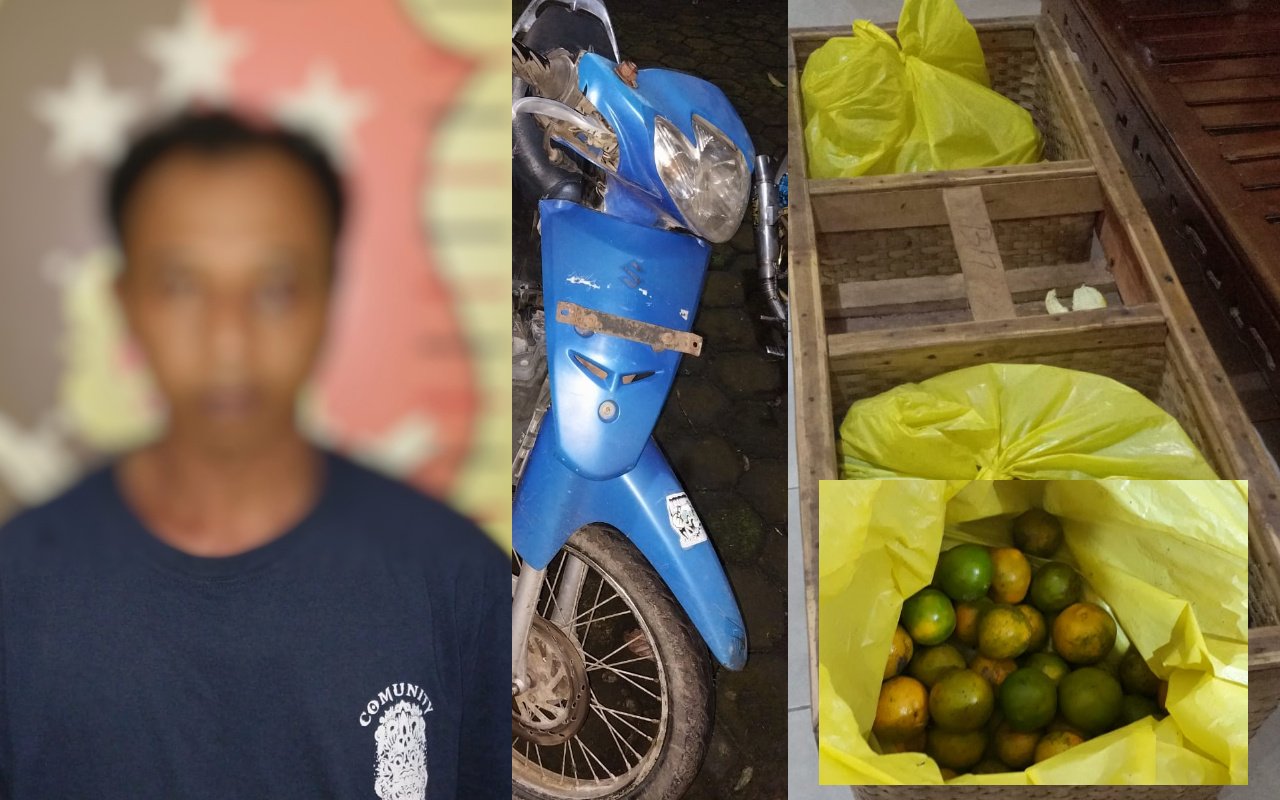 BD, ditangkap warga dengan barang bukti motor Suzuki Shogun tanpa plat nomor, buah jeruk sebanyak 80 kilogram, dan sebuah tobos bambu yang digunakan untuk tempat buah hasil curian tersebut. Tak berselang lama di kantor desa, warga langsung menghubungi Polsek Cluring, untuk tindakan lebih lanjut.