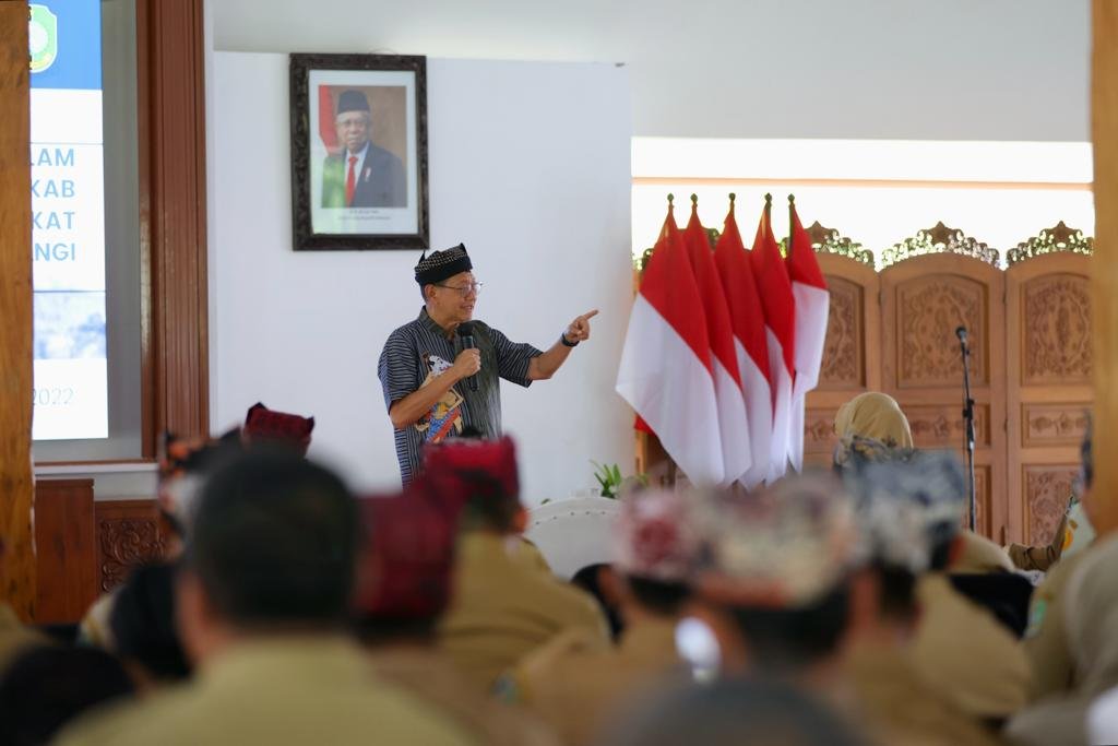 Banyuwangi, seblang.com – Untuk memompa semangat pelayanan kepada masyarakat di jajaran Pemkab Banyuwangi, Bupati Banyuwangi mengundang Hermawan Kertajaya. Pakar marketing dunia sekaligus CEO Mark Corp tersebut memperkenalkan Marketing 5.0 kepada para Aparatur Sipil Negara (ASN) dan masyarakat Banyuwangi di Pendopo Sabha Swagata Blambangan, Selasa (15/11/2022).
