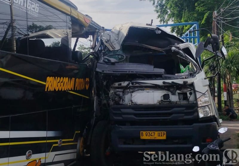 Bus PO Pringgondani Putra bernopol K-7005-C terlibat tabrakan dengan truk fuso bernopol B-9347-UIP.