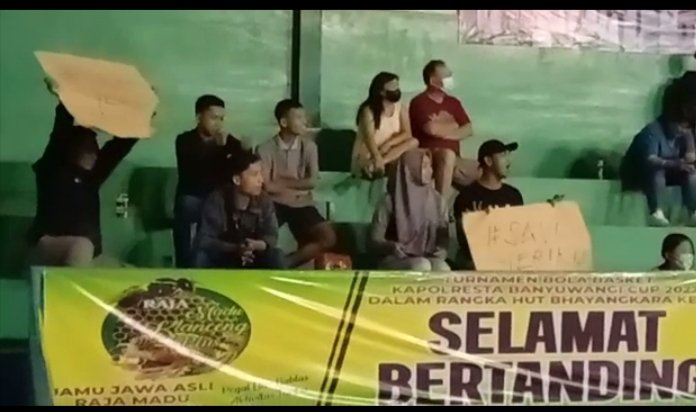Banyuwangi, seblang.com – Tagar (#) Save Yerikho muncul di tribun penonton yang sedang menyaksikan laga semi final Kejuaraan Bola Basket Kapolresta Banyuwangi Cup 2022 antara Tim Basket Bharawangi versus Surya Jajag BC Banyuwangi di GOR Sahabat Banyuwangi pada Sabtu (23/07/2022) malam.