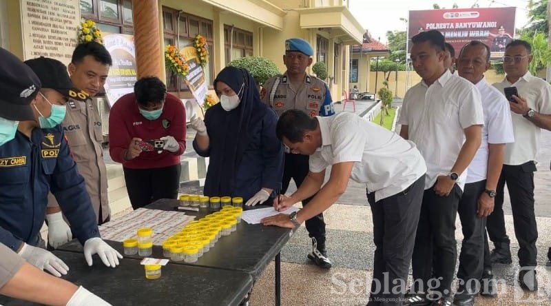 Banyuwangi, seblang.com – Polresta Banyuwangi menggelar tes urine mendadak terhadap seluruh personel di halaman Mapolresta Banyuwangi, Rabu (21/1/2026). Pemeriksaan dilakukan sebagai langkah deteksi dini dan pencegahan penyalahgunaan narkoba di internal kepolisian.