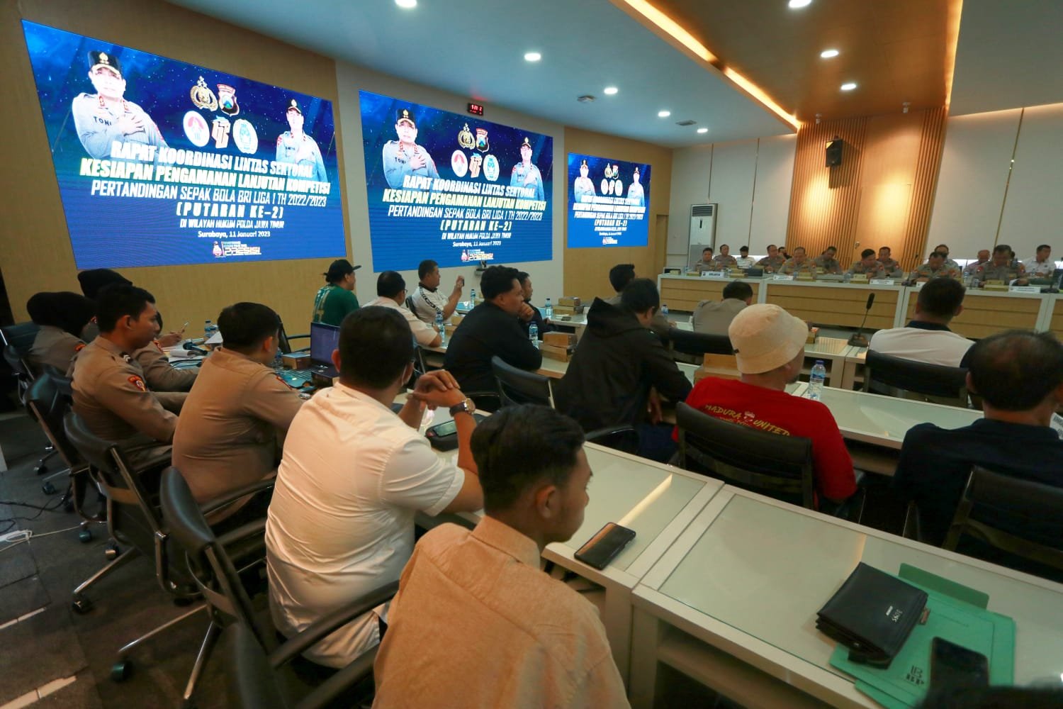 Surabaya, seblang.com – Persiapan pengamanan kompetisi BRI Liga 1 musim 2022/2023 putaran kedua, pihak Polda Jawa Timur telah menggelar rapat koordinasi ( rakor) di Rupatama Polda Jatim kemarin Rabu (11/1/23).