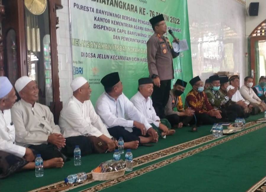 Banyuwangi, seblang.com – Dalam rangkaian HUT Bhayangkara ke-76, Polresta Banyuwangi terus menebar kebaikan. Pada Jumat (24/6/2022), Polresta Banyuwangi bekerjasama dengan Pengadilan Agama (PA) Banyuwangi serta Dinas Kependudukan dan Pencatatan Sipil (Dispendukcapil) Banyuwangi, menggelar isbat nikah masal dan pengobatan gratis di Desa Jelun, Kecamatan Licin.
