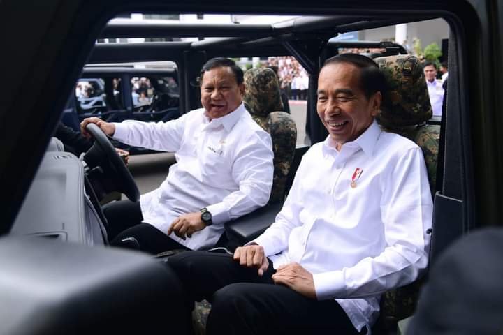 Dalam mobil yang dikendarai langsung oleh Menteri Pertahanan Prabowo Subianto, Presiden Jokowi meninjau pameran alat utama sistem pertahanan (alutsista) yang merupakan bagian dari rangkaian acara rapat pimpinan.