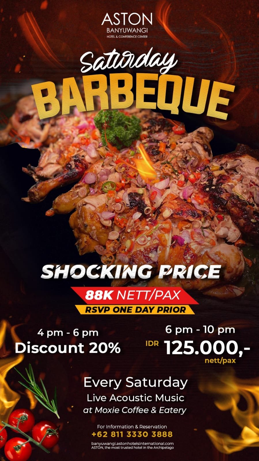 “Harga reguler Saturday Barbeque sendiri dipatok Rp 125.000,- nett/pax, akan tetapi kami beri harga special Shocking Rate seharga dengan menu-menu internasional dan promo ini bersifat All You Can Eat (Makan Sepuasnya),” tambah Catur.