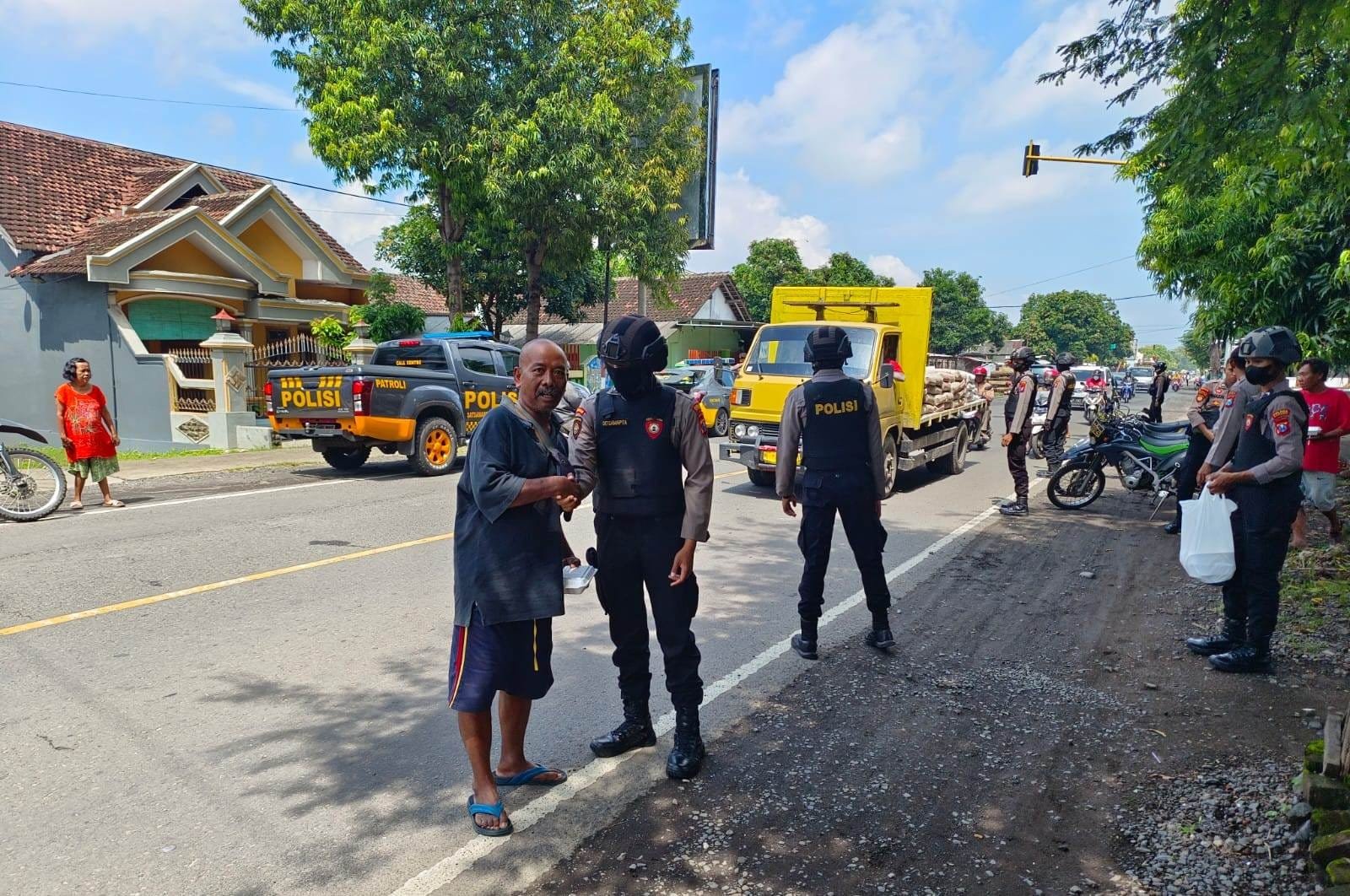Situbondo, seblang.com – Sejumlah pedagang asongan, tukang becak, ojek daring, sopir angkutan dan warga kurang mampu yang berada di jalan protokol diberi nasi bungkus oleh personel Satuan Samapta Polres Situbondo Polda Jatim melalui program Patroli Samapta Bersedekah (Pasaber), Sabtu (4/3/2023) siang, di sela-sela kesibukannya berpatroli Kamtibmas, anggota menyempatkan diri untuk peduli sesama.